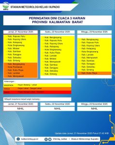 BERITAINKALBAR.COM – Badan Meteorologi, Klimatologi, dan Geofisika (BMKG) Stasiun Meteorologi Kelas I Supadio merilis peringatan dini cuaca tiga harian untuk wilayah Kalimantan Barat, berlaku mulai Sabtu, 22 November hingga Senin, 24 November 2025. Dalam laporan yang diperbarui pada Sabtu pukul 07.35 WIB tersebut, BMKG mengimbau masyarakat di sejumlah kabupaten/kota untuk mewaspadai hujan dengan intensitas sedang hingga lebat.