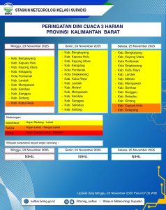 Lanjut pada Minggu, 23 November 2025, potensi hujan sedang–lebat berpeluang terjadi di: Kabupaten Kapuas Hulu, Kayong Utara, Ketapang, Kubu Raya, Landak, Melawi, Mempawah, Sekadau, Sintang.