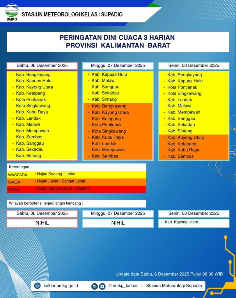 Pada Sabtu, 6 Desember 2025, BMKG menandai sejumlah wilayah dalam kategori waspada hujan sedang–lebat. Daerah yang berpotensi terdampak yakni Bengkayang, Kapuas Hulu, Kayong Utara, Ketapang, Kota Pontianak, Kota Singkawang, Kubu Raya, Landak, Melawi, Mempawah, Sambas, Sanggau, Sekadau, dan Sintang.