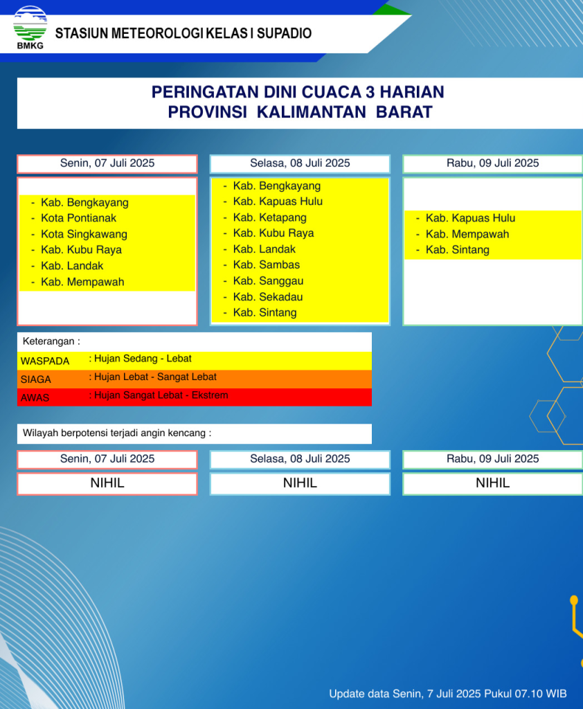 Pada Senin, 7 Juli 2025, BMKG menetapkan status WASPADA untuk hujan sedang hingga lebat yang dapat terjadi di beberapa wilayah, yakni Kabupaten Bengkayang, Kota Pontianak, Kota Singkawang, Kabupaten Kubu Raya, Kabupaten Landak, dan Kabupaten Mempawah. Meski intensitas hujan diperkirakan cukup signifikan, BMKG memastikan pada hari tersebut tidak ada wilayah yang berpotensi terjadi angin kencang.